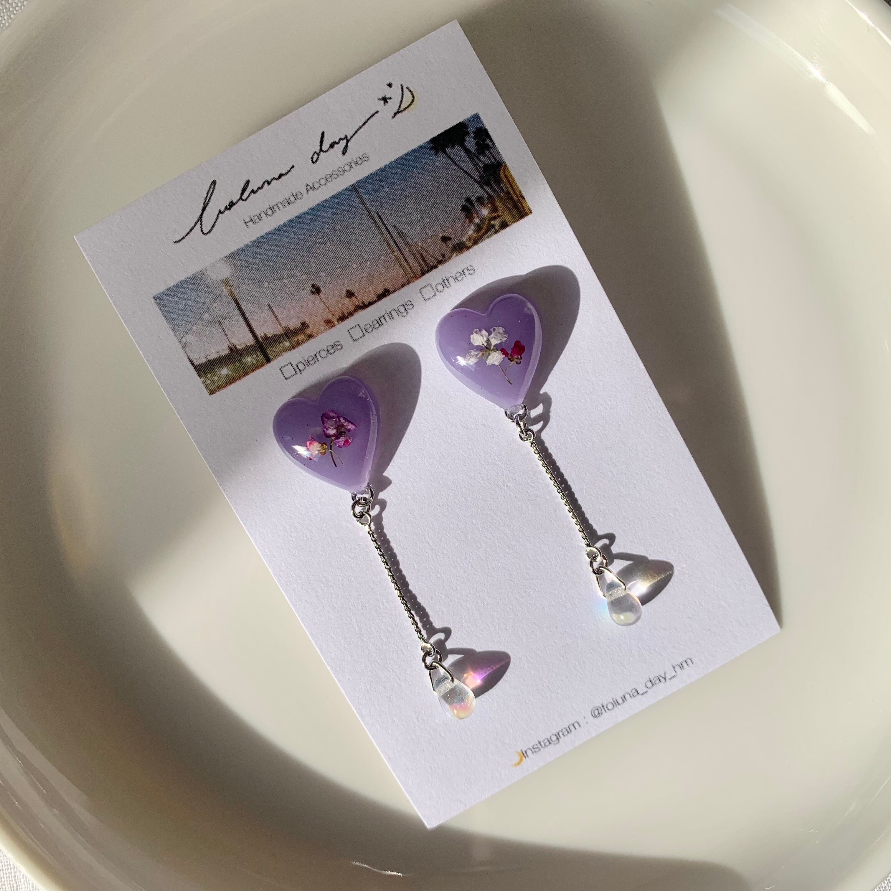 ピアス イヤリング ハート ラブリー 紫 パープル くすみ ドライフラワー アリッサム かすみ草 レジン 上品 繊細 大人可愛い 韓国 韓国風 おしゃれ ロング 揺れる