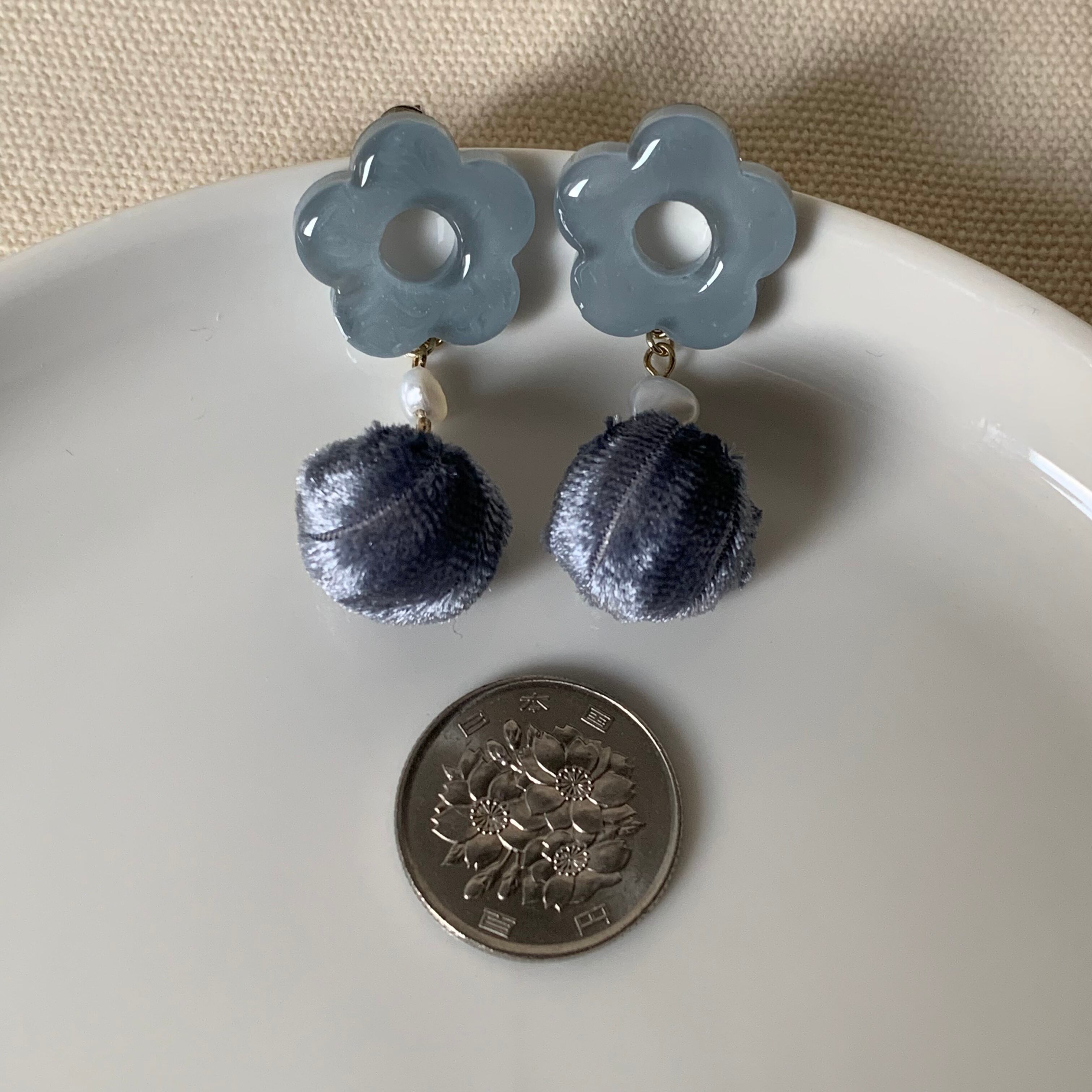 ピアス イヤリング 大ぶり 大きめ 韓国 くすみ ブルー 青 淡色 パール 上品 繊細 大人可愛い レトロ 花 ボンボン ワンポイント 揺れる