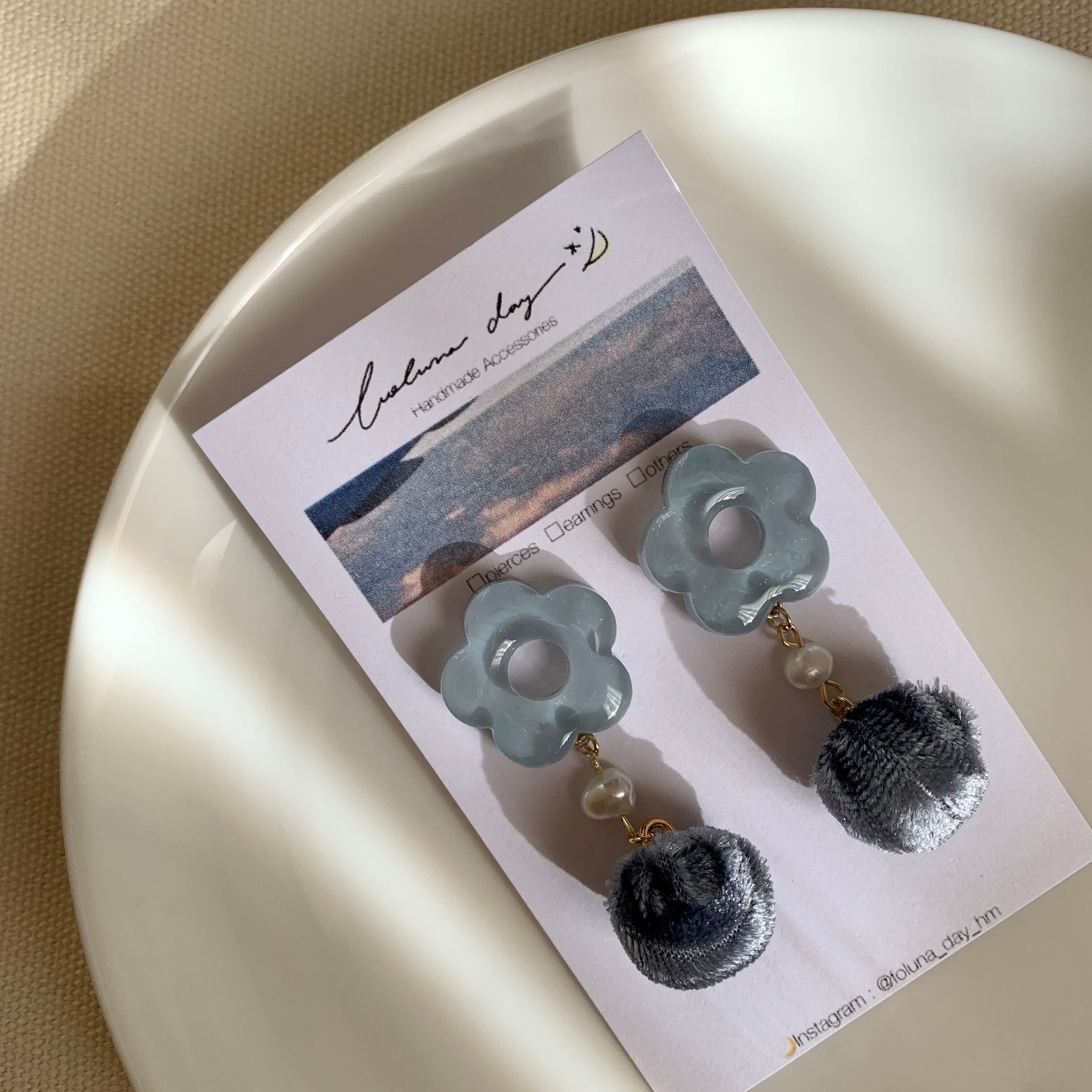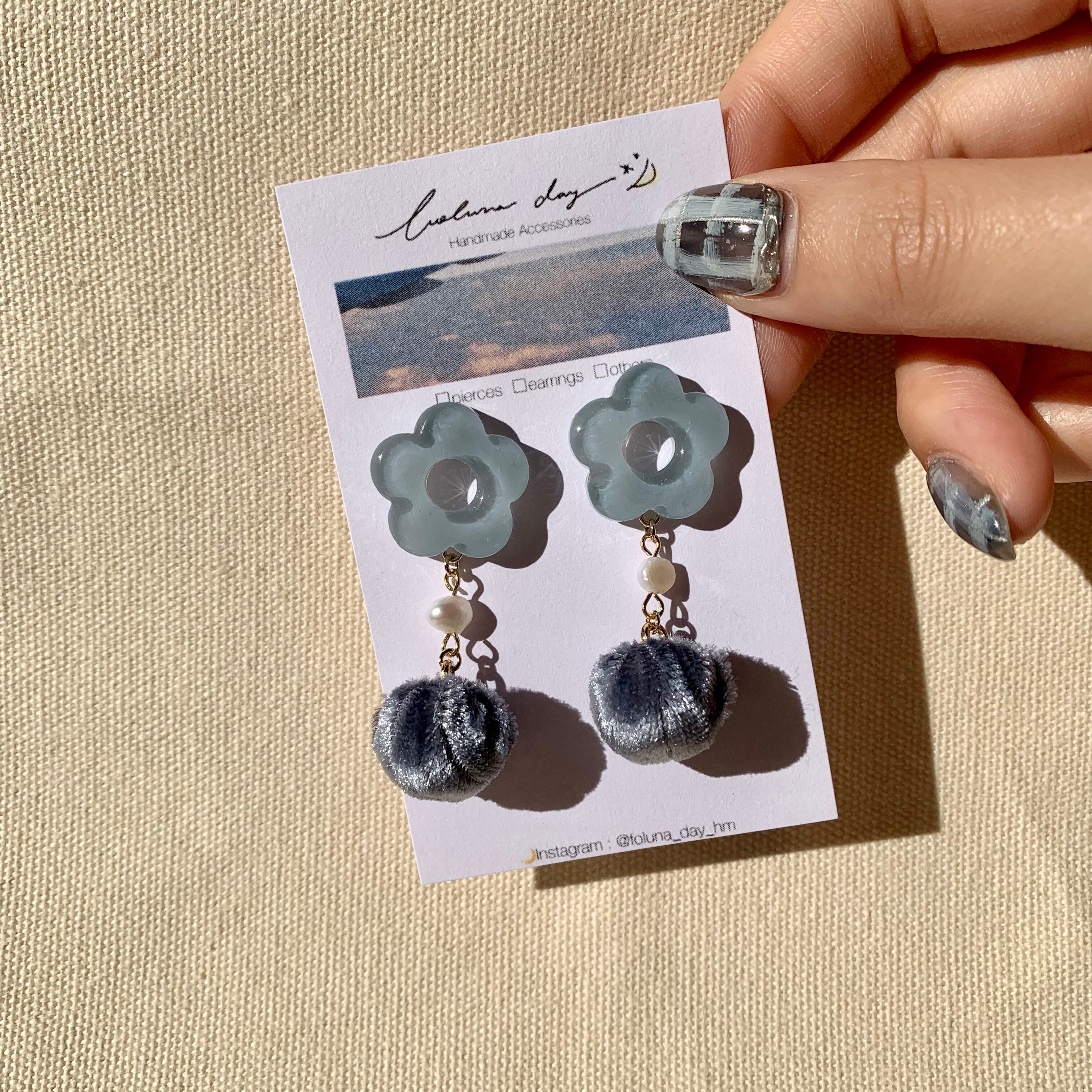 くすんだブルーのレジンパーツと深いブルーのベロアチャームを合わせてみました。少しレトロな雰囲気のアクセサリーです໒꒱