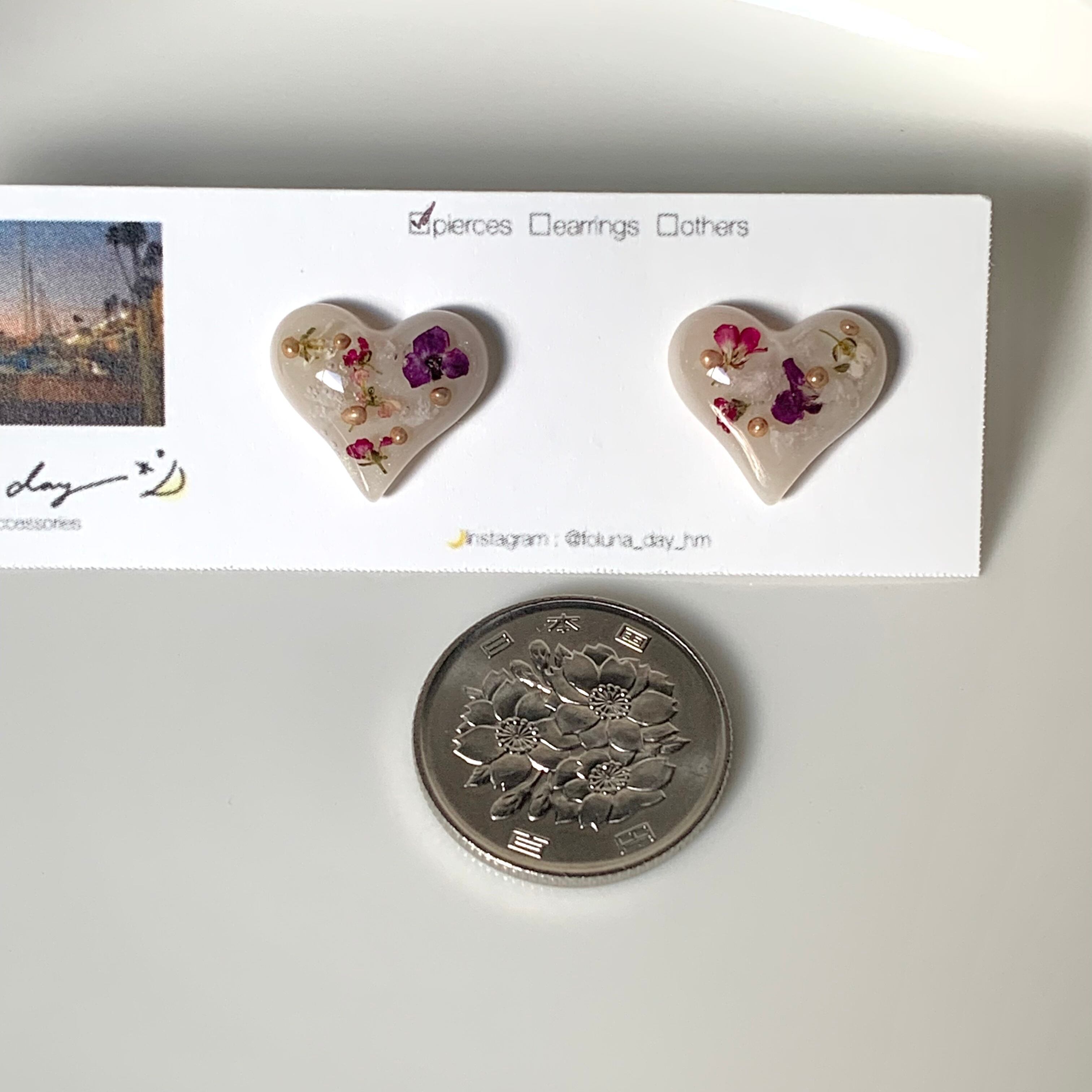 ピアス イヤリング 韓国 韓国風 アクセサリー 小ぶり 小さめ ラブリー バレンタイン ハート クリーム ベージュ ドライフラワー 上品 繊細 普段使い 使いやすい