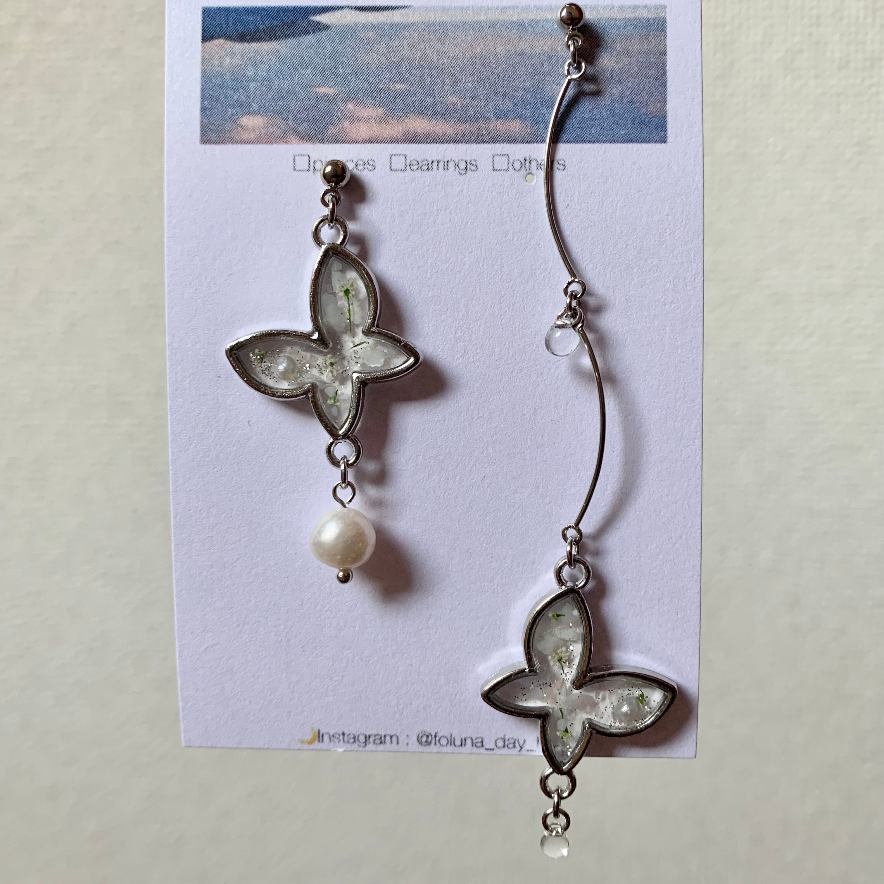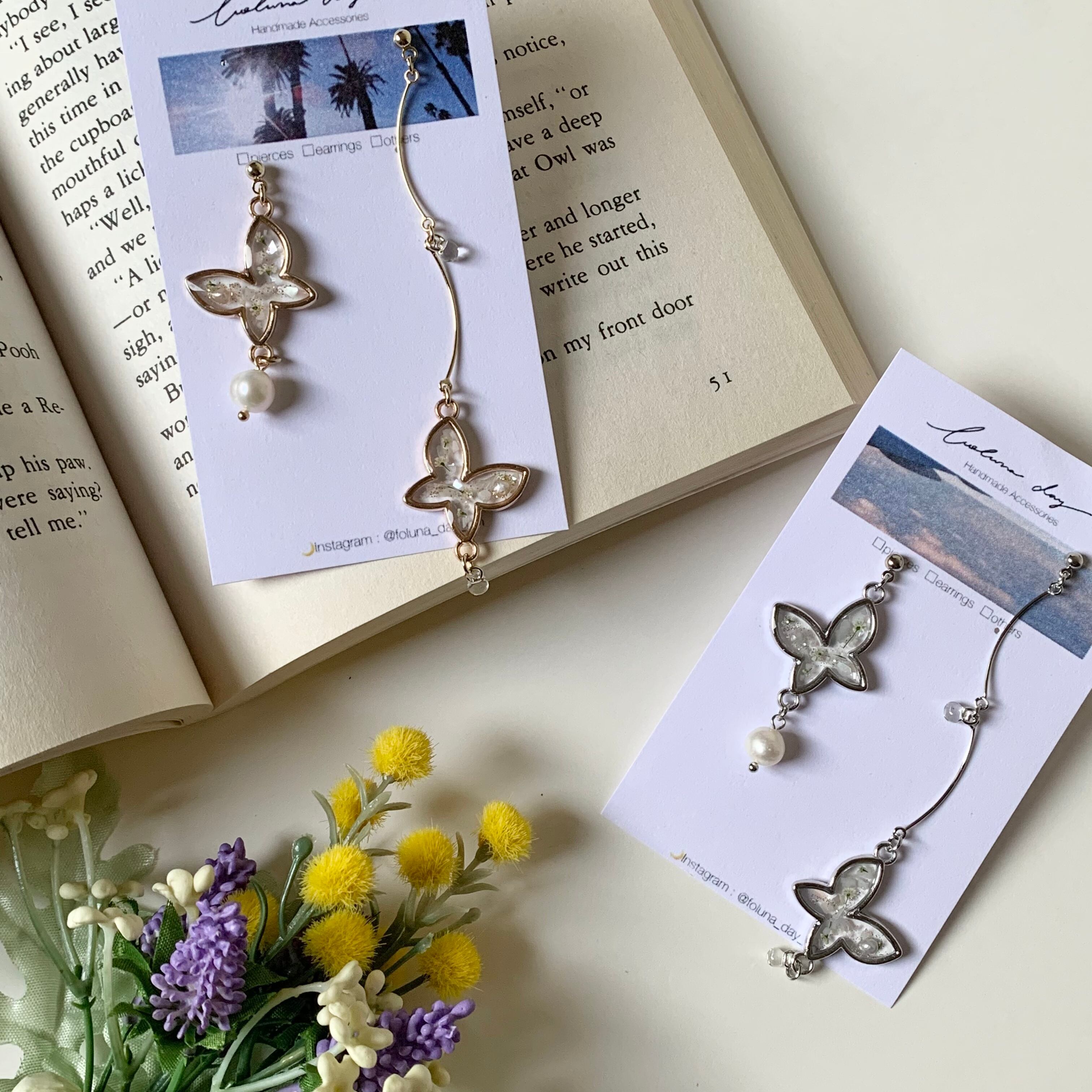 ピアス イヤリング 淡色 淡水パール パール レースフラワー かすみ草 ドライフラワー クリア 春夏 フェミニン ガーリー 蝶 爽やか ホワイト 韓国 韓国風 上品 繊細 おしゃれ 揺れる 大ぶり 大きめ ロング 長め 可愛い 大人可愛い アクセサリー