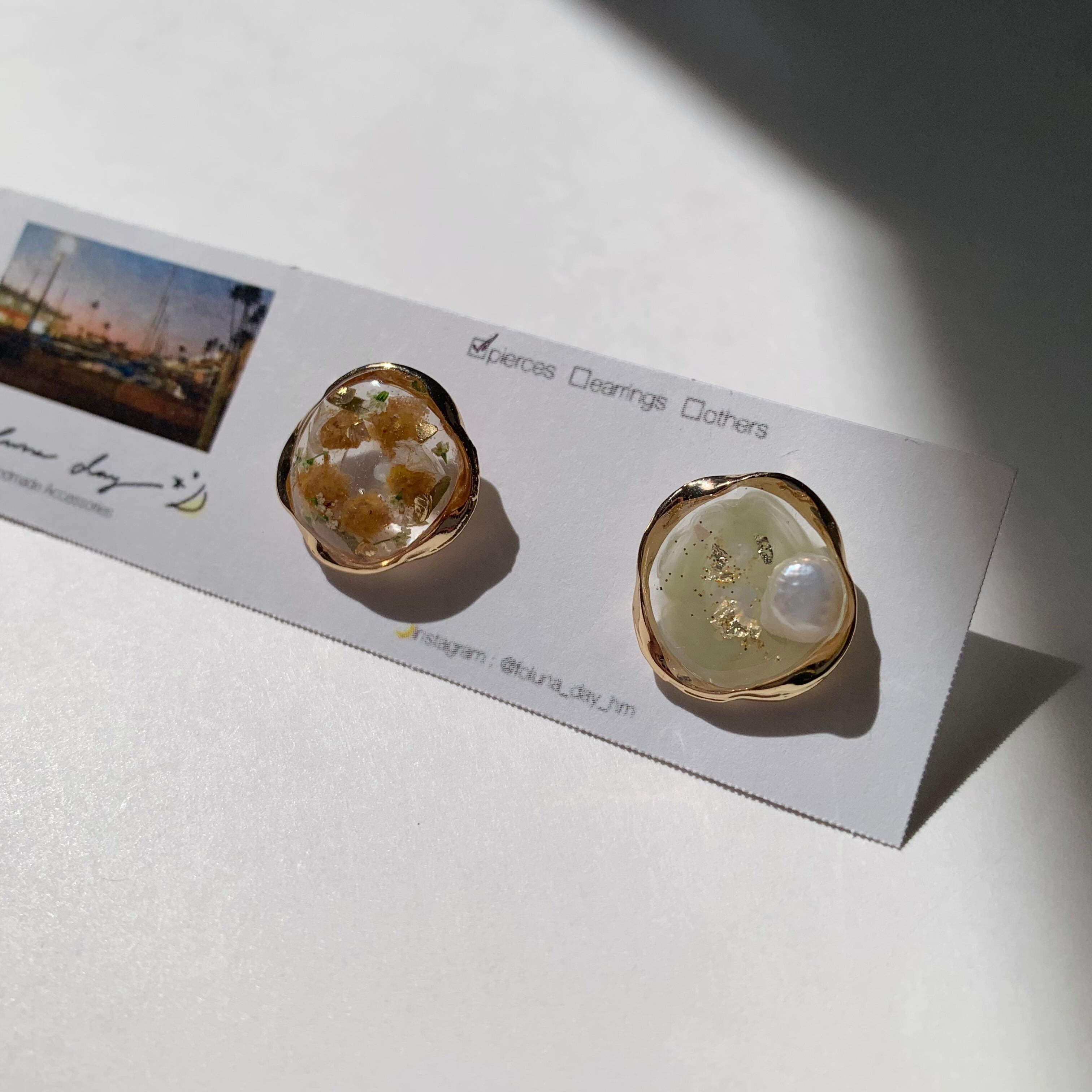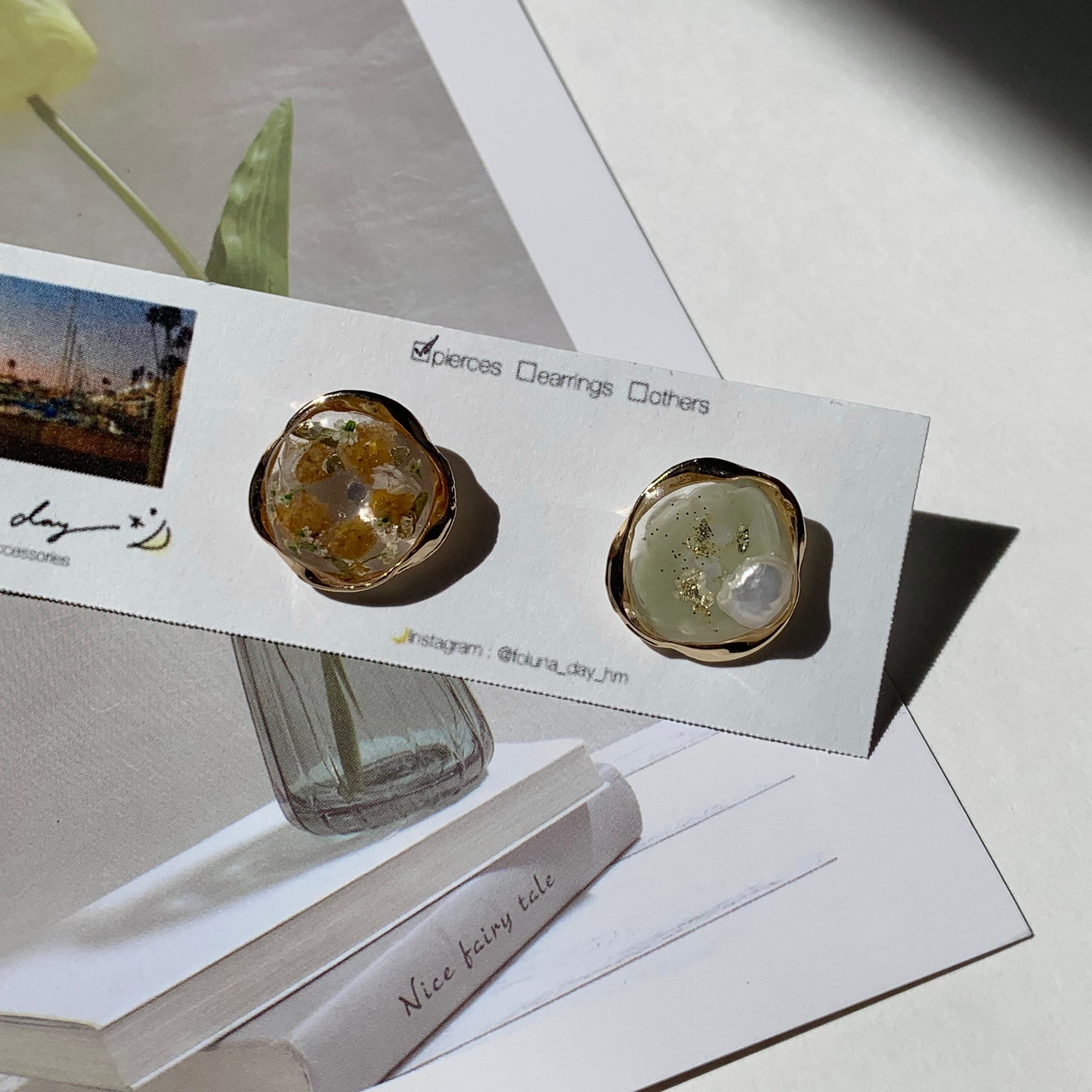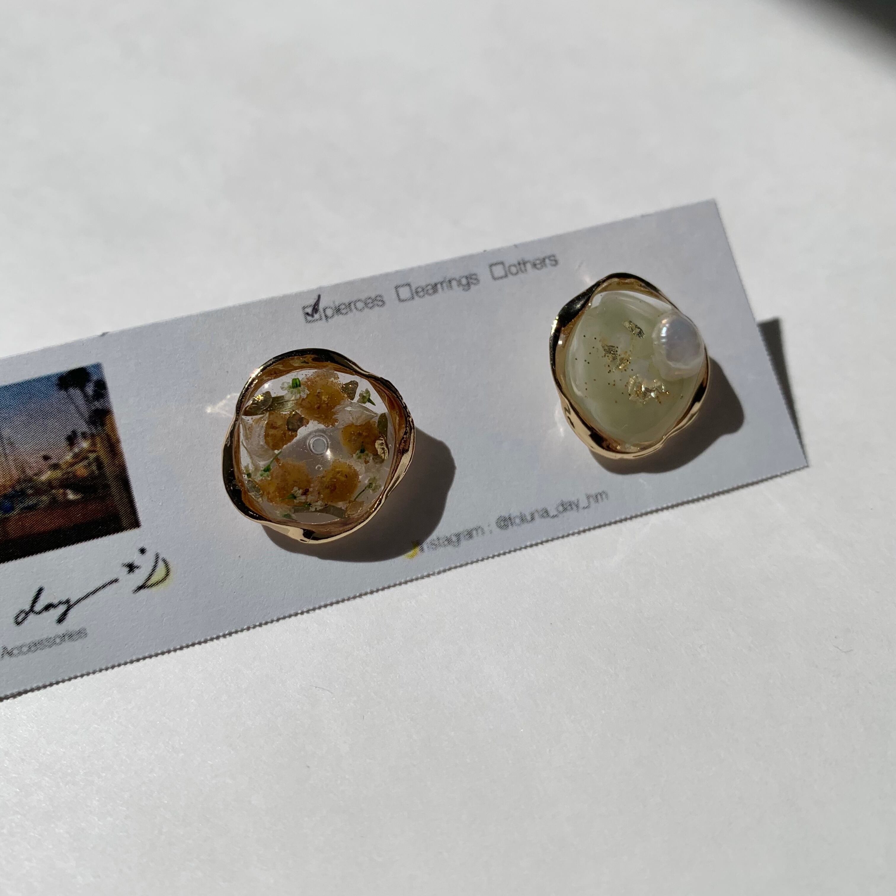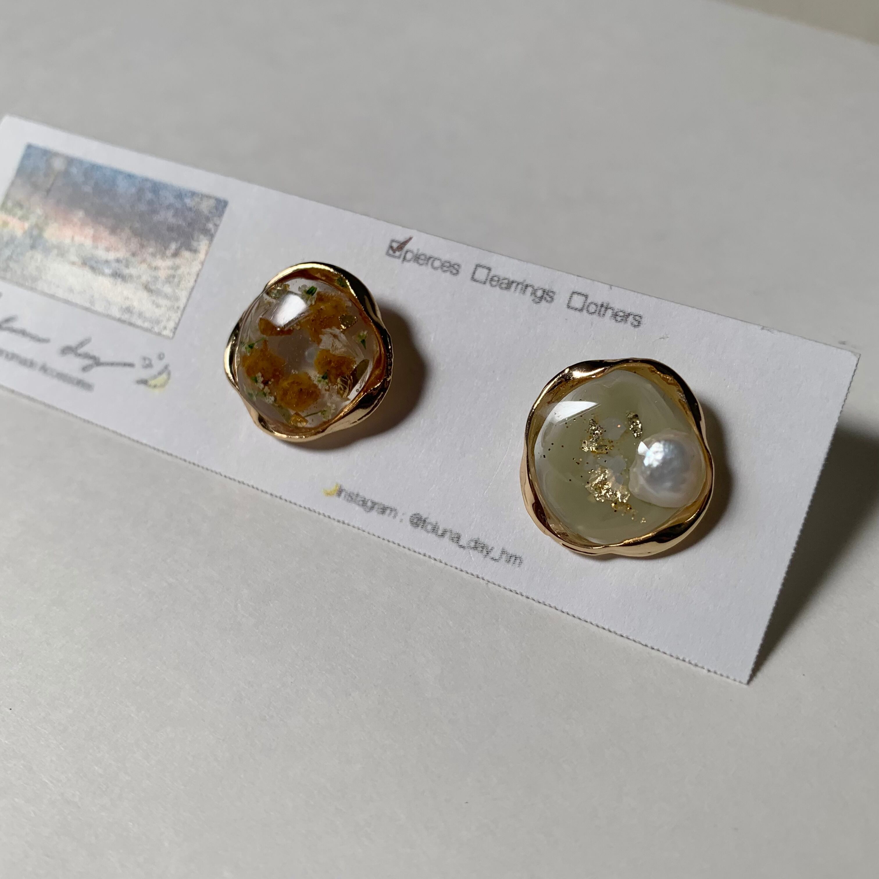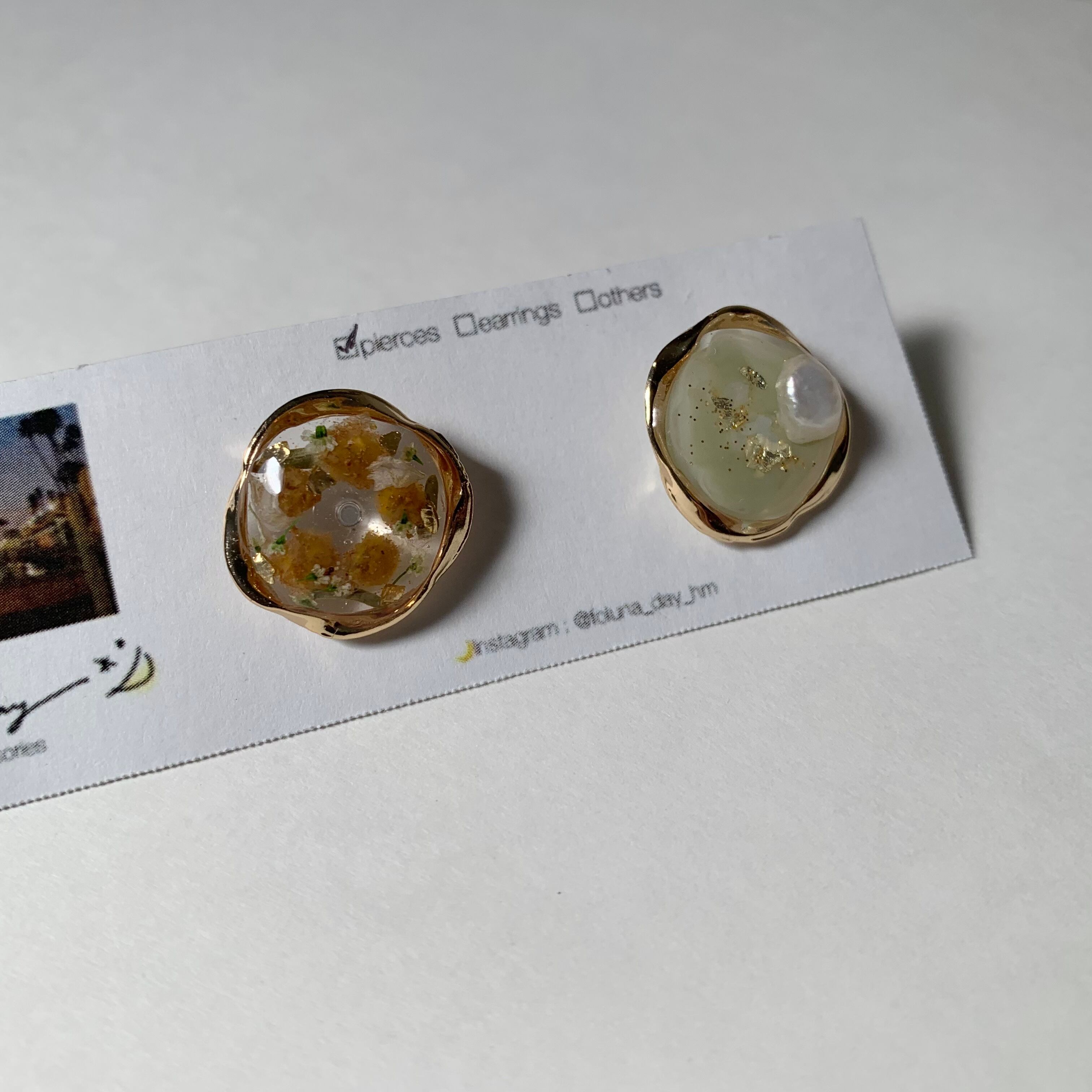 ピアス イヤリング 淡色 くすみ 春 夏 上品 繊細 おしゃれ グリーン クリア 透明 丸 ラウンド チャーム ゴールド フラワー 花 パール 小さめ 小ぶり 大人っぽい 可愛い 大人可愛い アクセサリー シンプル アシンメトリー