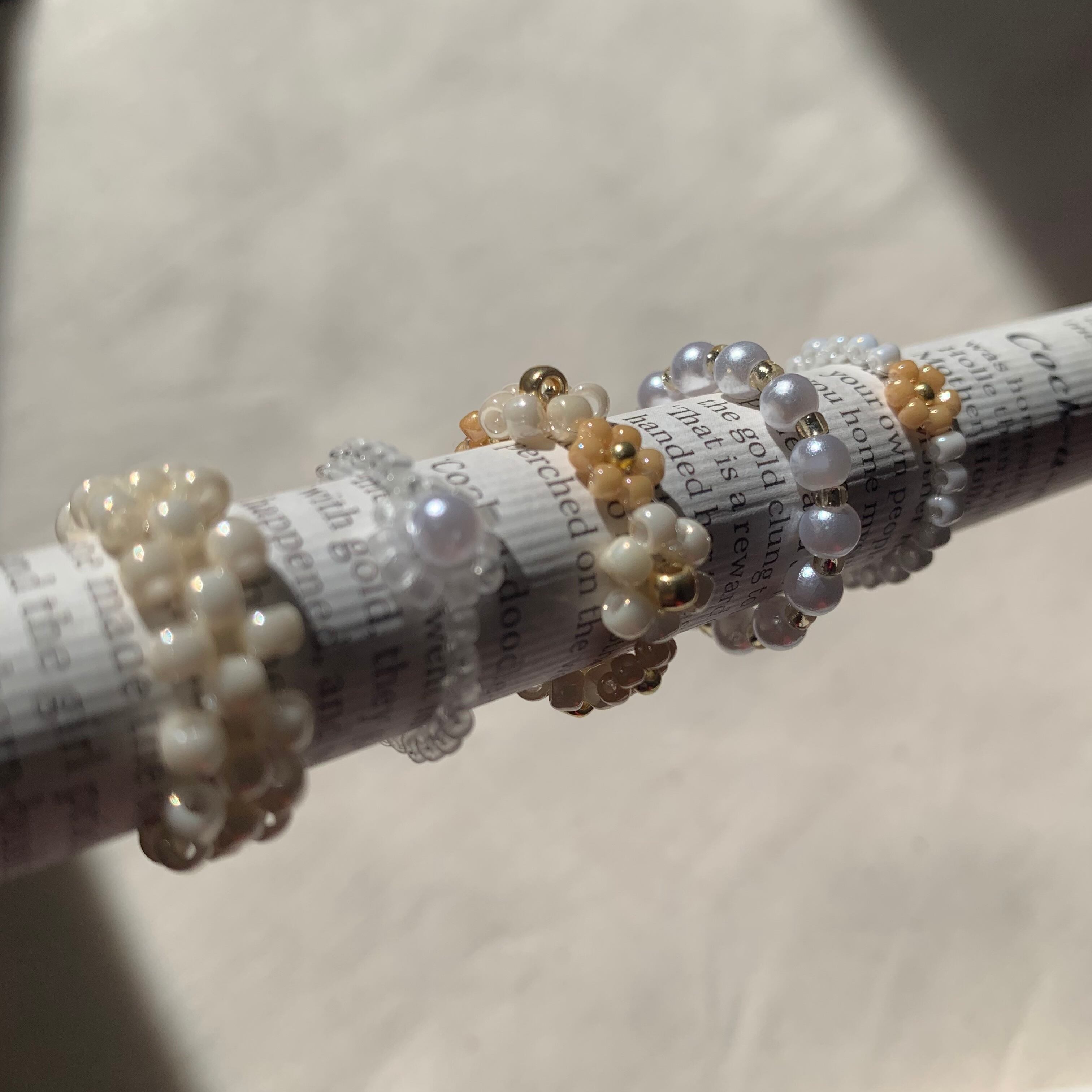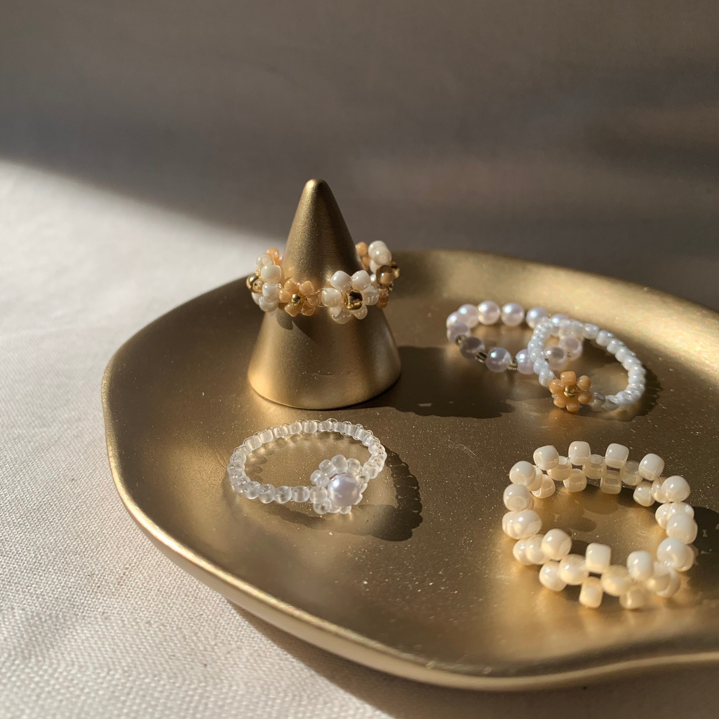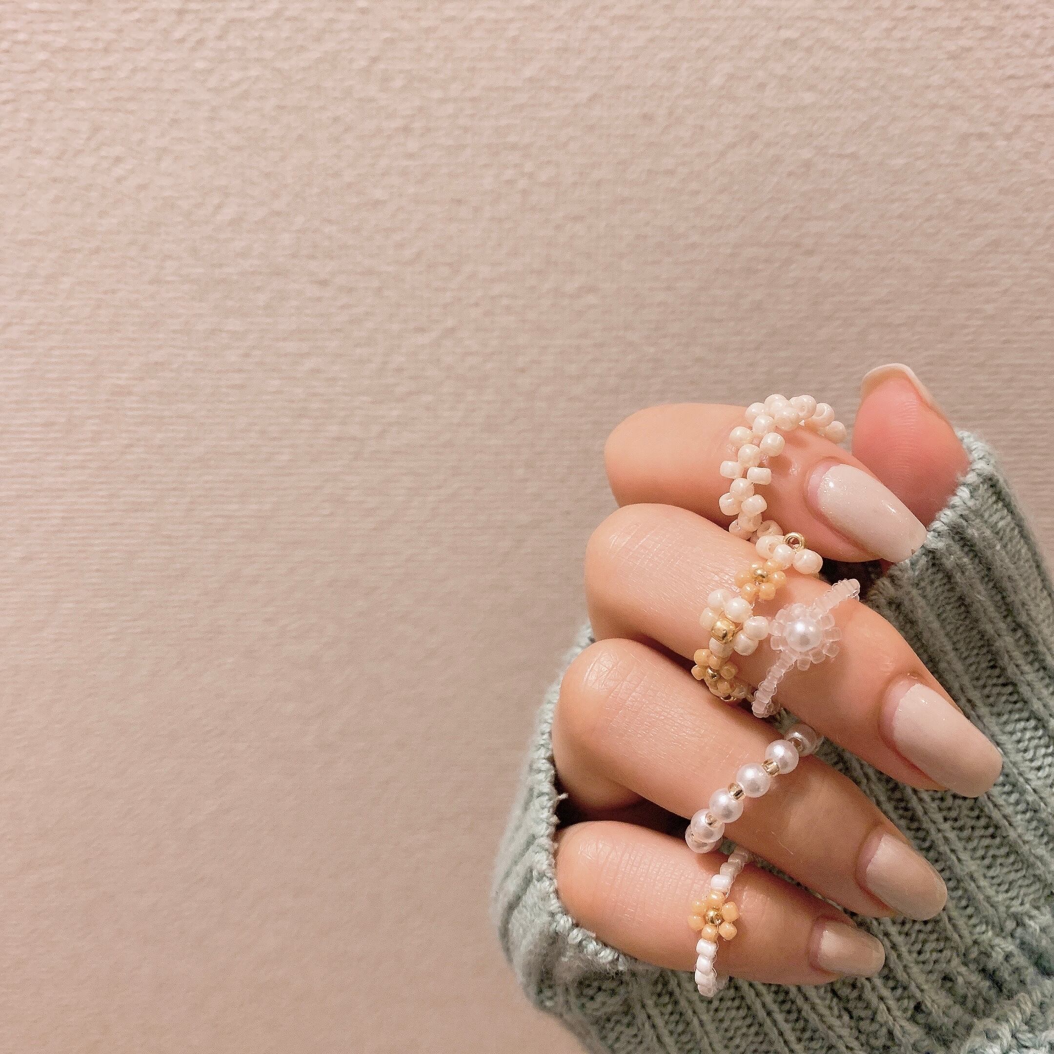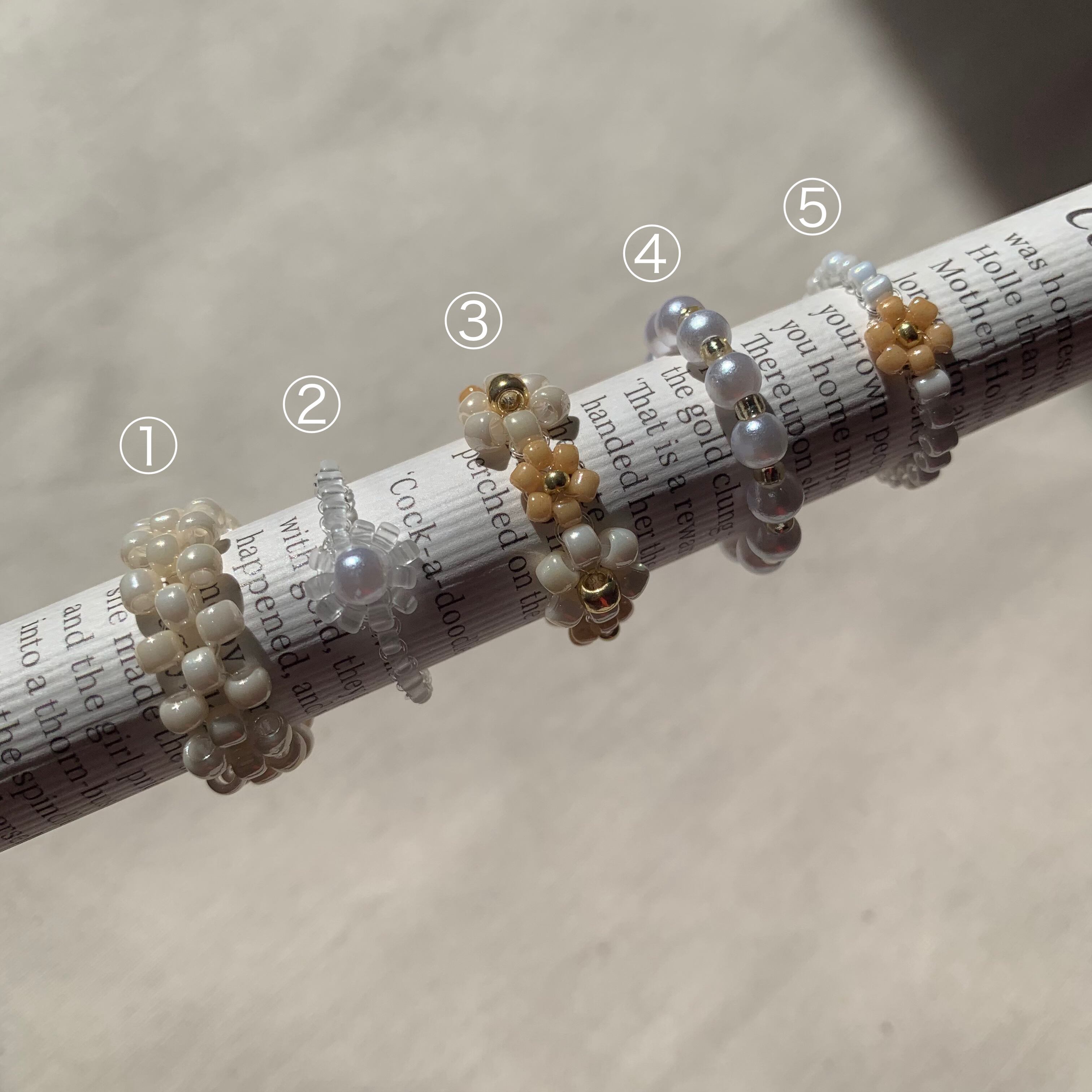 ビーズリング 春色 春 淡色 韓国 韓国ファッション 華奢 上品 繊細 おしゃれ 小ぶり 指輪 お花 フラワー ベージュ ホワイト クリーム ゴールド 大人可愛い フェミニン ラブリー アクセサリー