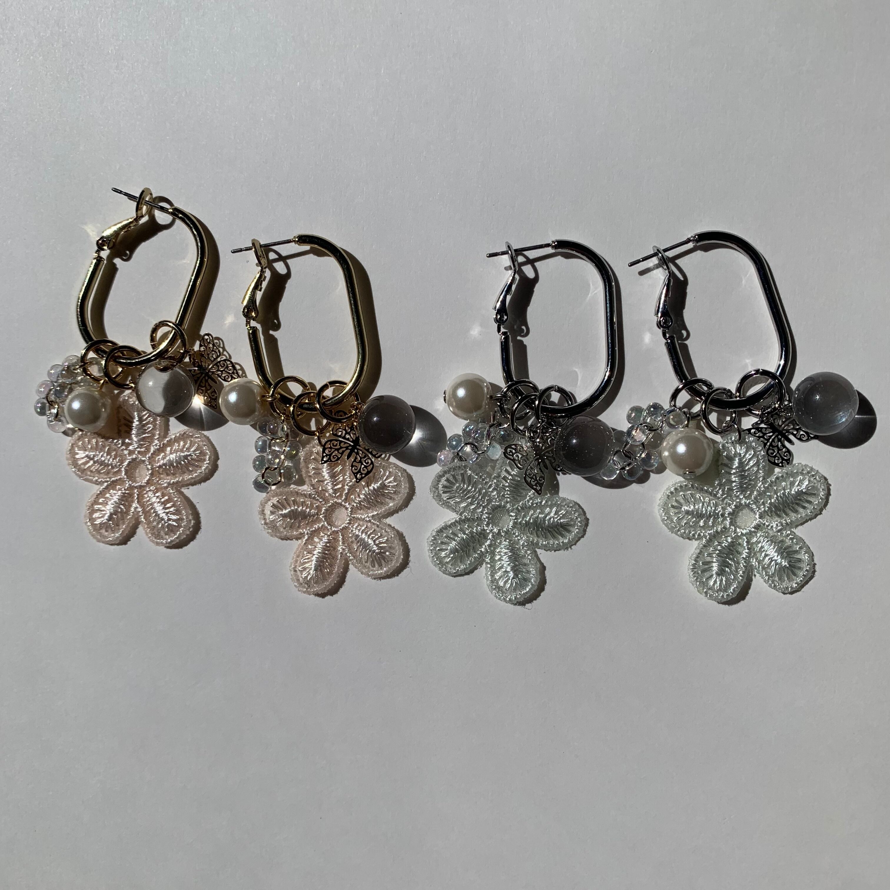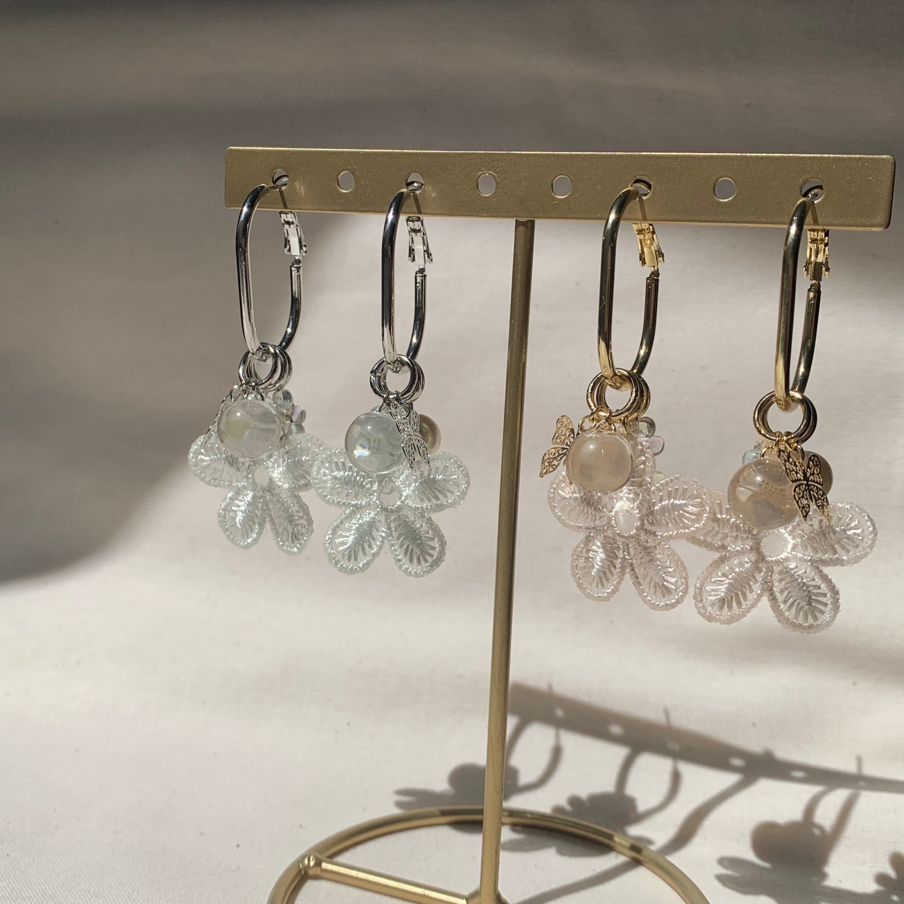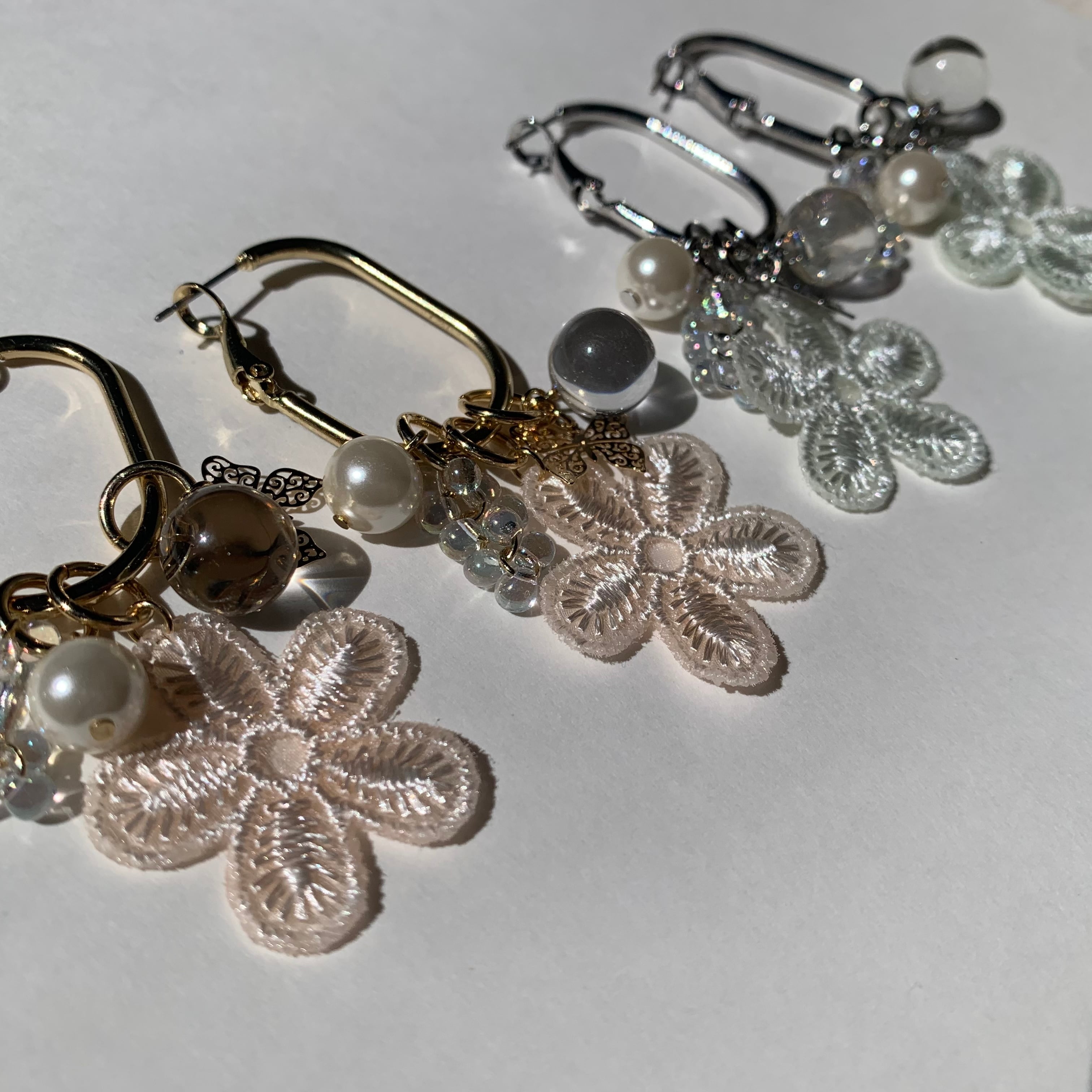 ピアス イヤリング 春色 春 淡色 韓国 韓国ファッション レース ナチュラル ピンク グリーン 繊細 上品 おしゃれ 優しい お花 フラワー 大人可愛い ラブリー フェミニン アクセサリー 大ぶり 個性的 透明感