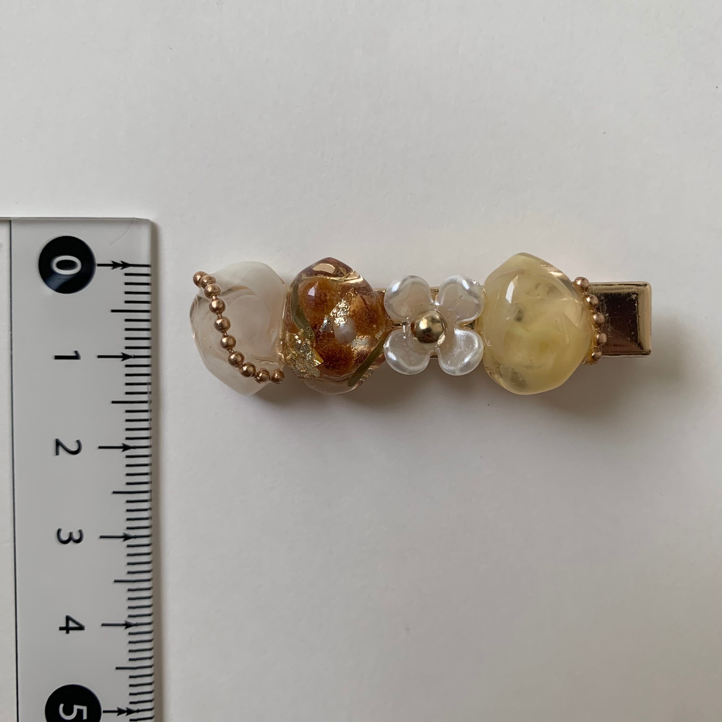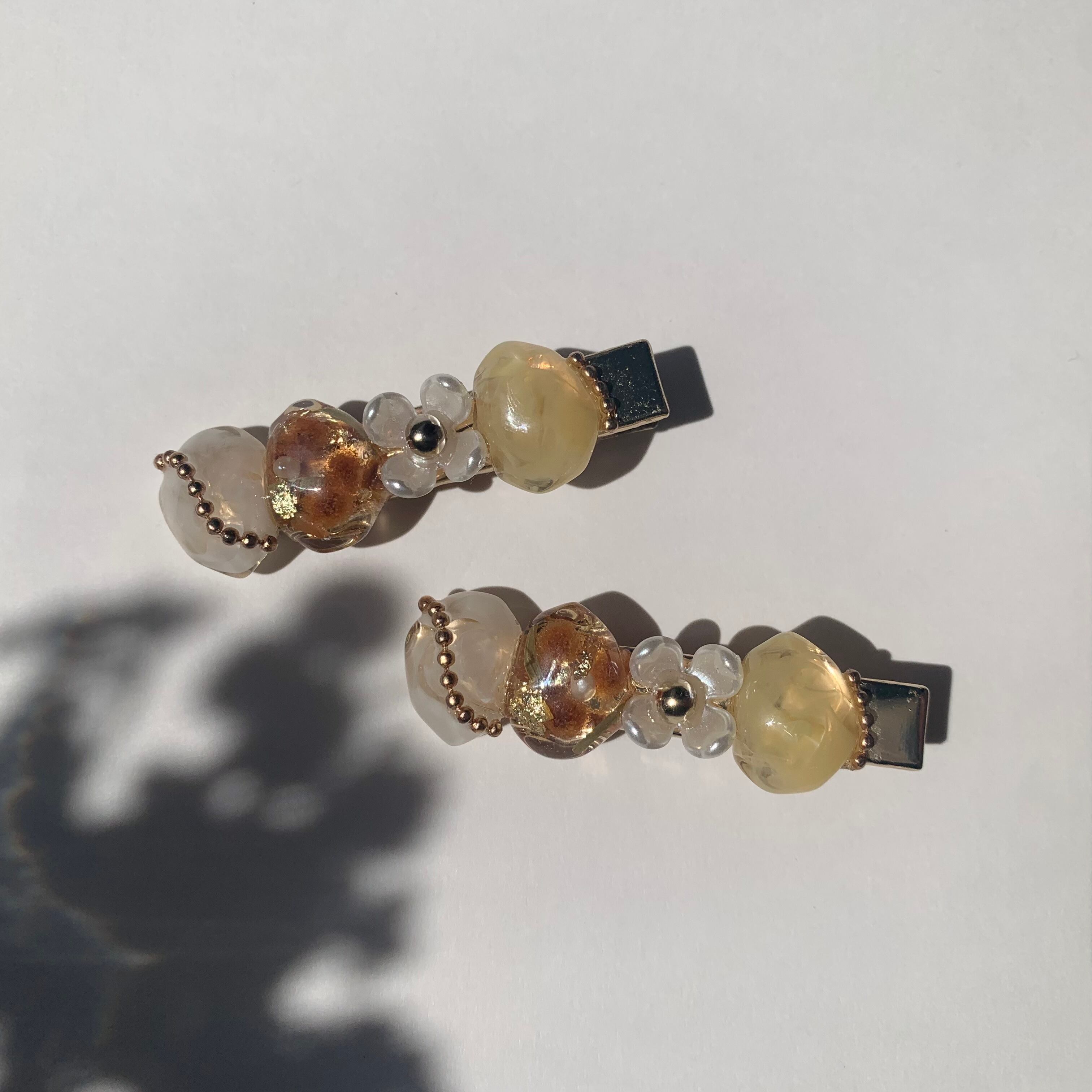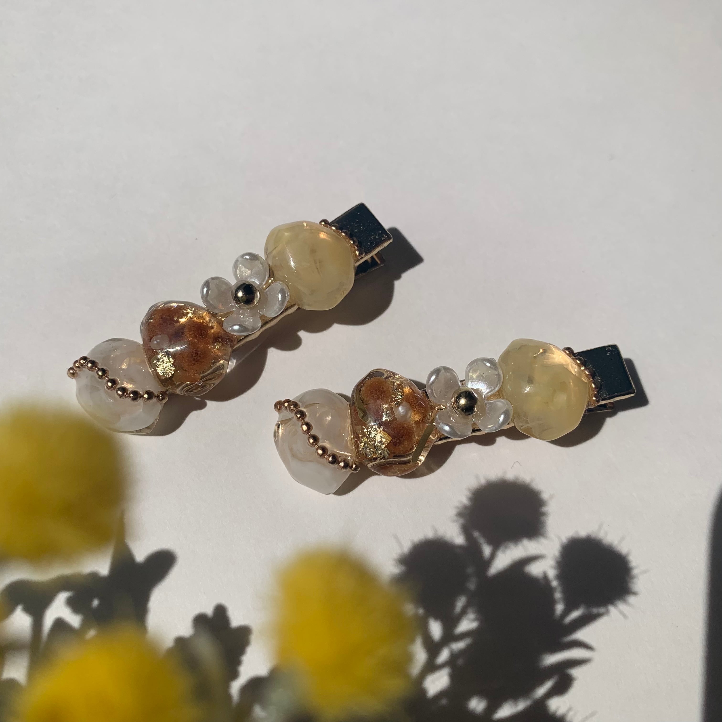ヘアクリップ ミモザ 淡色 優しい 韓国 黄色 イエロー 白 ホワイト マーブル 繊細 上品 おしゃれ 華やか 鉱石風 大人可愛い ラブリー フェミニン ニュアンス アクセサリー おしゃれ チェーン 個性的