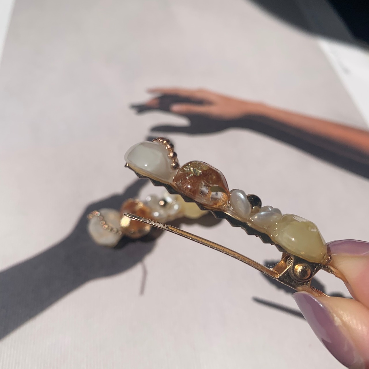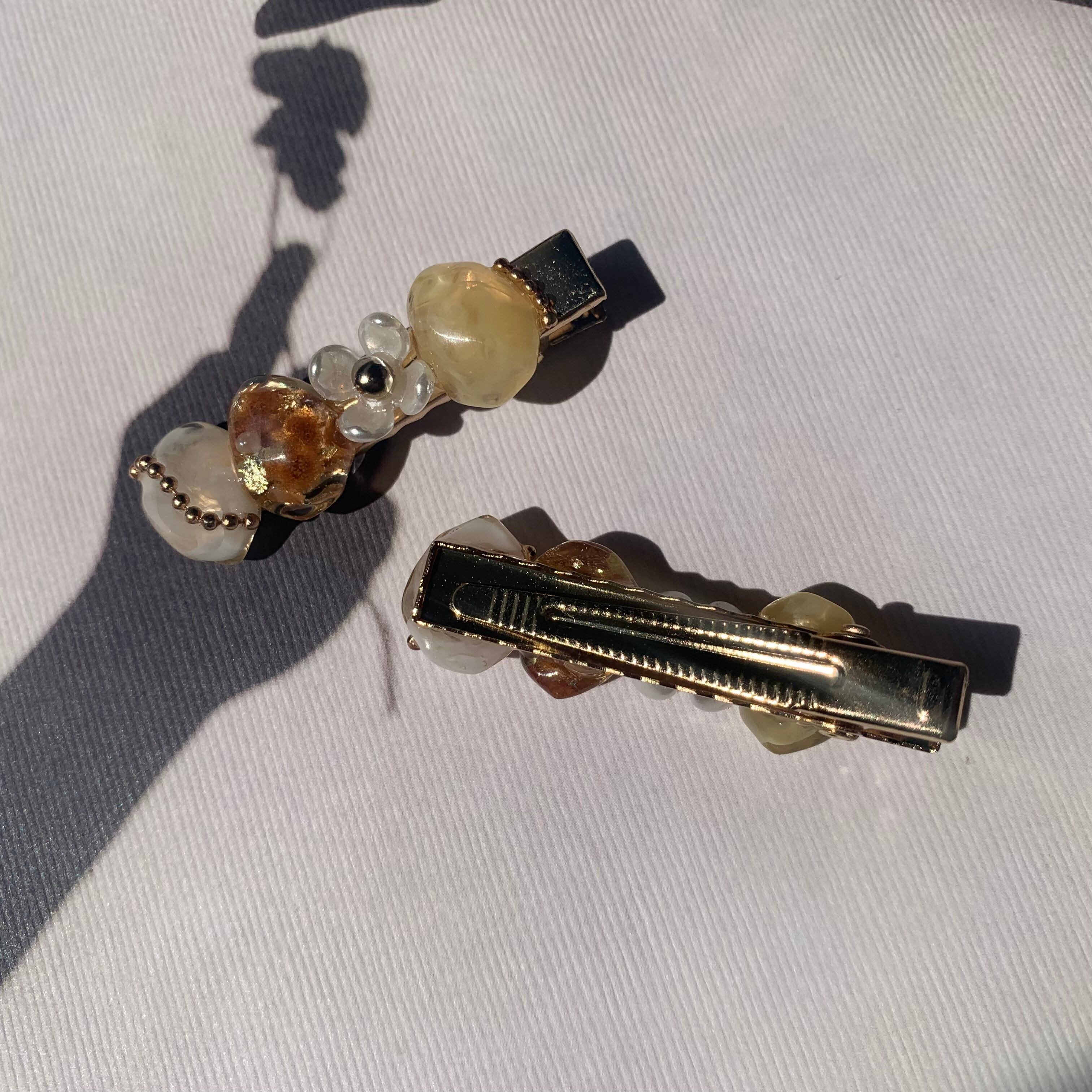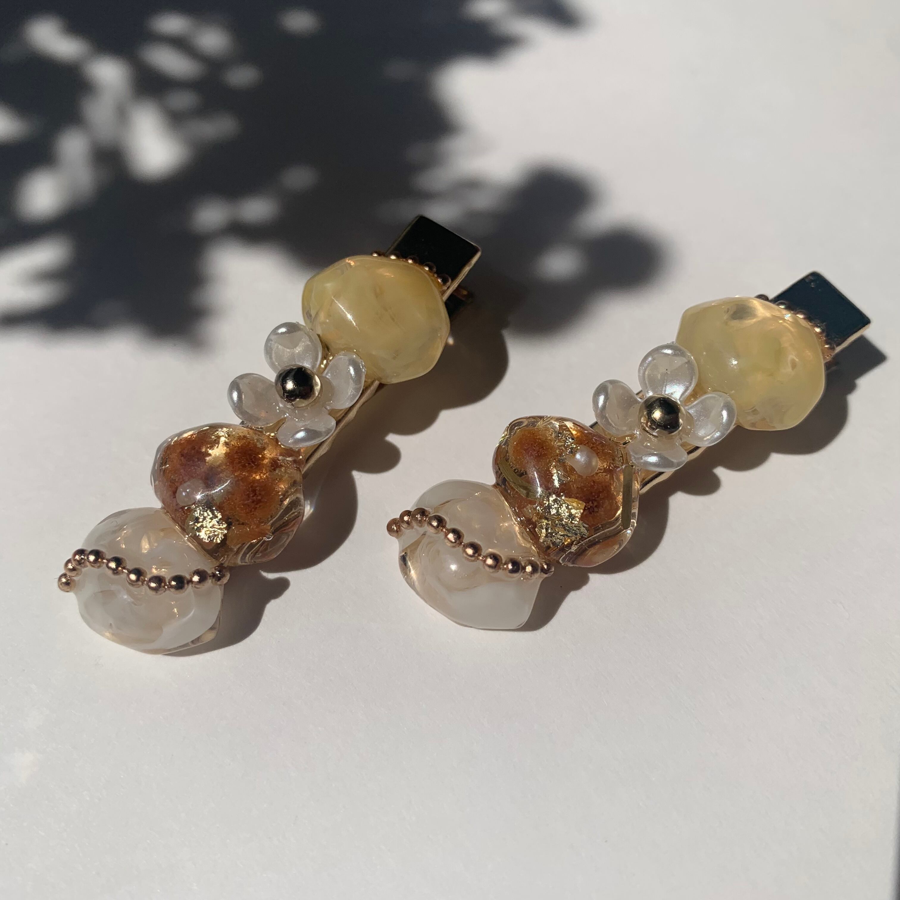 ヘアクリップ ミモザ 淡色 優しい 韓国 黄色 イエロー 白 ホワイト マーブル 繊細 上品 おしゃれ 華やか 鉱石風 大人可愛い ラブリー フェミニン ニュアンス アクセサリー おしゃれ チェーン 個性的